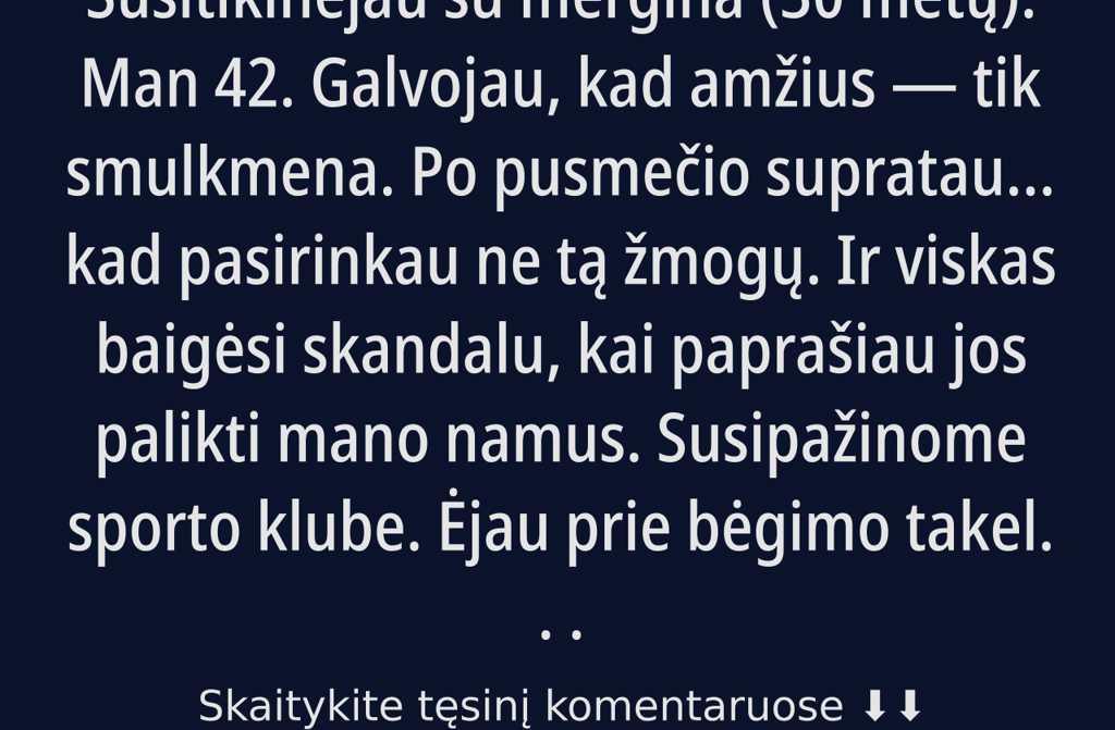 Susitikinėjau su mergina (30 metų). Man 42. Galvojau, kad amžius tik smulkmena. Po pusmečio supratau… kad pasirinkau ne tą žmogų. Ir viskas baigėsi skandalu, kai paprašiau jos palikti mano namus.