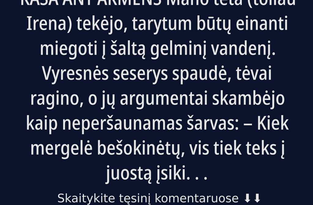 Mano teta (toliau Irena) tekėjo, tarytum būtų einanti miegoti į šaltą gelminį vandenį. Vyresnės seserys spaudė, tėvai ragino, o jų argumentai skambėjo kaip neperšaunamas šarvas: