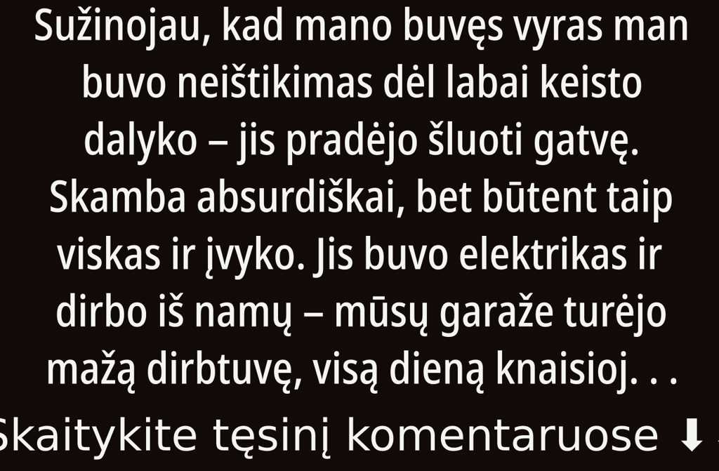Sužinojau, kad mano buvęs vyras man buvo neištikimas dėl labai keisto dalyko jis pradėjo šluoti gatvę. Skamba absurdiškai, bet būtent taip viskas ir įvyko. Jis buvo elektrikas ir dirbo iš namų mūsų garaže turėjo mažą dirbtuvę, visą dieną knaisiojo su laidais, įrankiais, klientais. Niekada nebuvo tas žmogus, kuris imtųsi namų ruošos. Ne todėl, kad būtų tinginys ar išlepęs jam tiesiog nepatiko buitiniai darbai. Laisvu metu jis mėgdavo pailsėti įsijungdavo televizorių, išgėrė butelį Švyturio alaus su draugais, kartais išsikepdavo ką nors ant grilio kieme. Ramus žmogus, niekada nebuvo iš tų, kuriems patinka šurmulys ar nuotykiai. Niekuomet nerodė agresijos, buvo tarsi iš tų, kurie net nekelia jokių įtarimų.