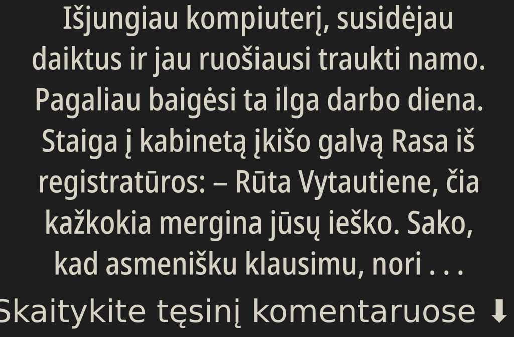 Išjungiau kompiuterį, susidėjau daiktus ir jau ruošiausi traukti namo. Pagaliau baigėsi ta ilga darbo diena. Staiga į kabinetą įkišo galvą Rasa iš registratūros: