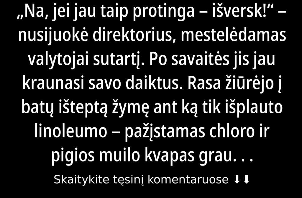Na, jei jau taip protinga išversk! nusijuokė direktorius, mestelėdamas valytojai sutartį. Po savaitės jis jau kraunasi savo daiktus.