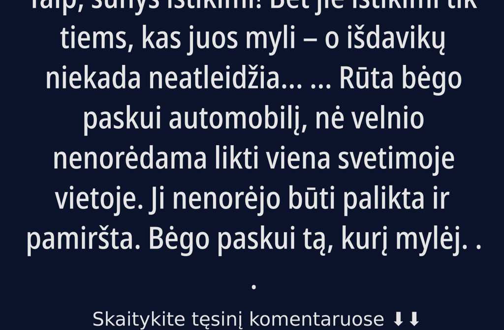 Ir Rūta pašoko bėgt. Ji vijosi automobilį, nenorėdama būti svetimoje vietoje viena. Bėgo paskui tą, kurį mylėjo, kuriuo tikėjo, ir kurio niekaip neišduotų.