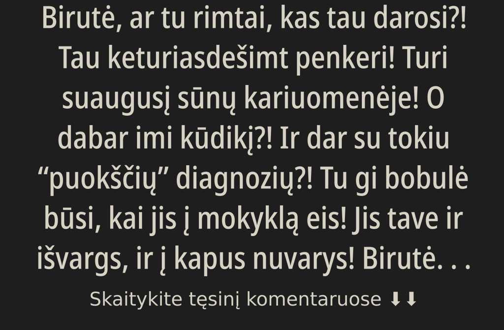 Birutė, ar tu rimtai, kas tau darosi?! Tau keturiasdešimt penkeri! Turi suaugusį sūnų kariuomenėje! O dabar imi kūdikį?! Ir dar su tokiu puokščių diagnozių?! Tu gi bobulė būsi, kai jis į mokyklą eis! Jis tave ir išvargs, ir į kapus nuvarys!