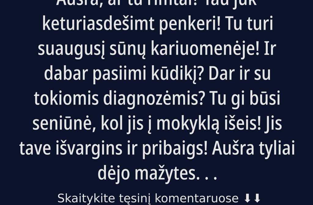 Aušra, ar tu rimtai? Tau juk keturiasdešimt penkeri! Tu turi suaugusį sūnų kariuomenėje! Ir dabar pasiimi kūdikį? Dar ir su tokiomis diagnozėmis? Tu gi būsi seniūnė, kol jis į mokyklą išeis! Jis tave išvargins ir pribaigs!