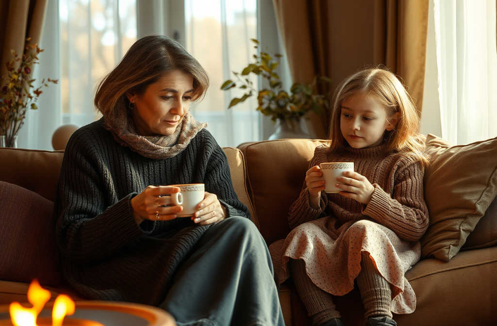 Raimas tyliai ištrauka ranką link kavos aparato. Storas juodas srautas užpildo porceliano puodelį, garų srautas kyla į vėsų rytą, vingiuodamas kaip dūmai po išgesusios ugnies. Jis atsargiai patiesia puodelį dukrai, o šis paprastas veiksmas kupinas tylių supratimų.