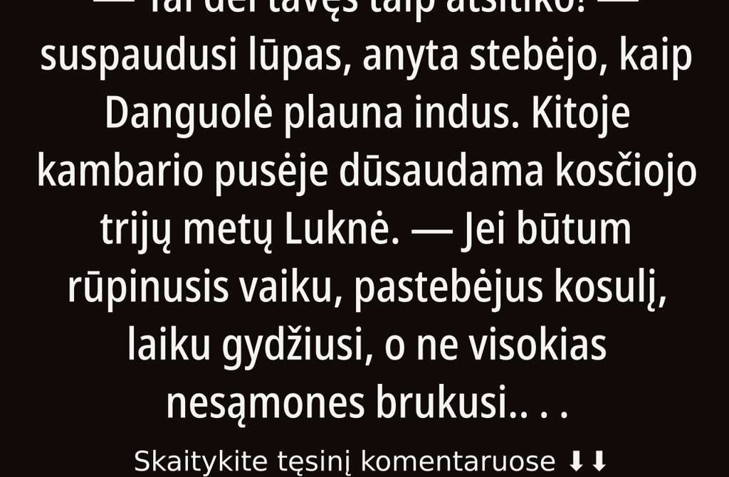 Tai dėl tavęs taip atsitiko! suspaudusi lūpas, anyta stebėjo, kaip Danguolė plauna indus. Kitoje kambario pusėje dūsaudama kosčiojo trijų metų Luknė. Jei būtum rūpinusis vaiku, pastebėjus kosulį, laiku gydžiusi, o ne visokias nesąmones brukusi…