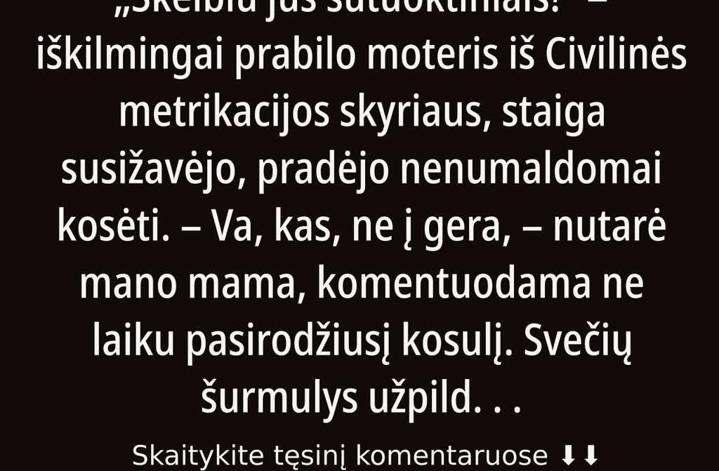Svečių šurmulys užpildė salę, jie šnibždėjosi. Mes su Daiva, jaunikis ir nuotaka, išgąstingai apsikeitėme žvilgsniais. Mums buvo po aštuoniolika. Iš tiesų dar vaikai. Tai buvo skubota vestuvė. Nuotaka atėjo su kraičiu.