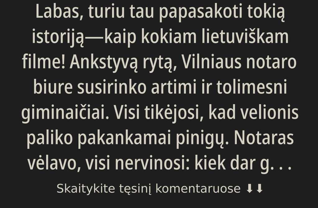 Labas, turiu tau papasakoti tokią istorijąkaip kokiam lietuviškam filme! Ankstyvą rytą, Vilniaus notaro biure susirinko artimi ir tolimesni giminaičiai. Visi tikėjosi, kad velionis paliko pakankamai pinigų. Notaras vėlavo, visi nervinosi: kiek dar galima laukti? Birutė, vyriausia Adomo dukra, vos ramiai sėdėjo: Noriu greičiau sužinoti, ar tėtis man ką nors paliko, kad galėčiau eiti. Tu, teta Danguole, turėtum elgtis ramiau. Reikia gedėti, visgi tėvas mirė, sumurmėjo Maiklas. Nekviesk manęs tetos, esu dar jauna. Kviestk vardu, piktai atkirto Danguole. O Maiklas burbtelėjo: Kad ir kiek dažai veidą ar išpuošinėji save, jauna nebetapsi.