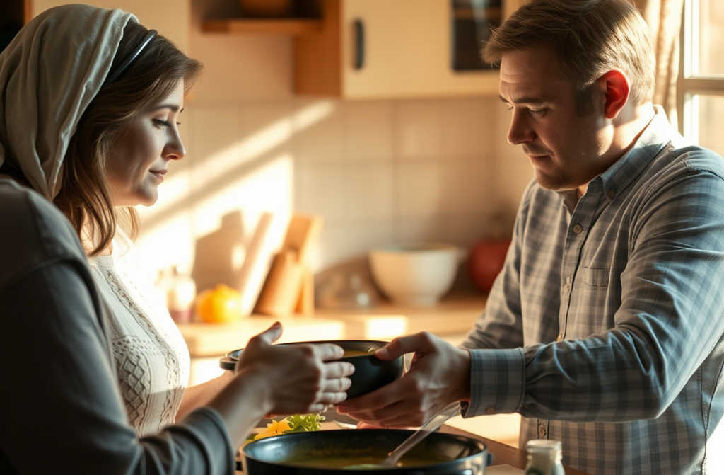 Kitą dieną ateina pas juos be įspėjimo. Atneša sriubos. Dukra nustemba, žentas šiek tiek sumišta.