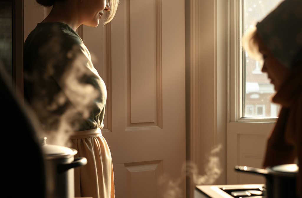 Ji stovėjo prie viryklės ir maišė didžiulėje puode, o veidas lyg pradžiugintas, nors ta šypsena skambėjo visai kitaip.