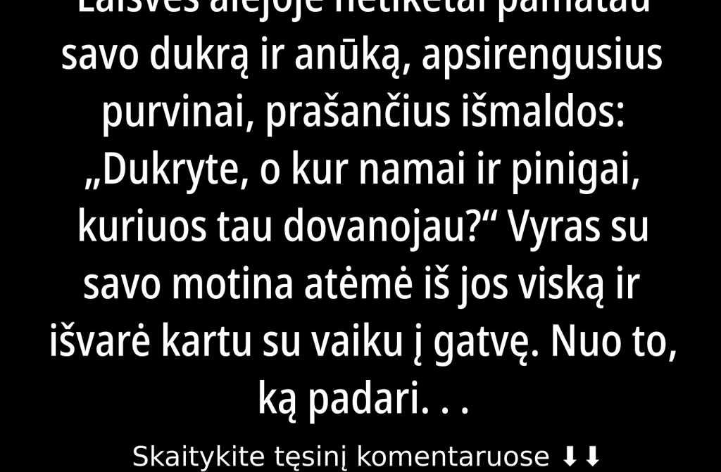 Laisvės alėjoje netyčia pamatau savo dukrą ir anūką, purvinus, prašančius išmaldos: Dukryte, o kur namai ir pinigai, kuriuos tau dovanojau?