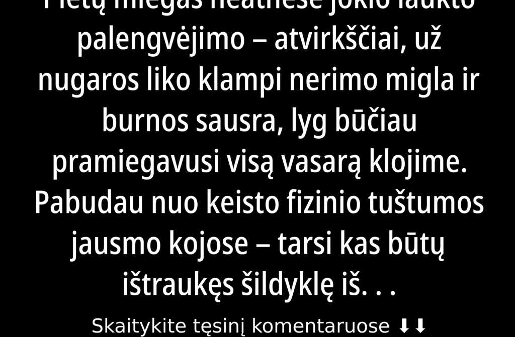 Dabar lova buvo tuščia, o paklodė gluminančiai šalta. Atsisėdau, nuleidau kojas ant parketo ir gūžtelėjau per visus namus lėkė skersvėjis, lyg butas būtų ne Vilniuje, o Neringos kopose be langų. Tyla buvo taip tanki, kad net spengė ausyse nėra nei nagų ciksėjimo ant grindų, nei atodūsio, nei šlamesio, kai šuo purto kailį. Nieko.