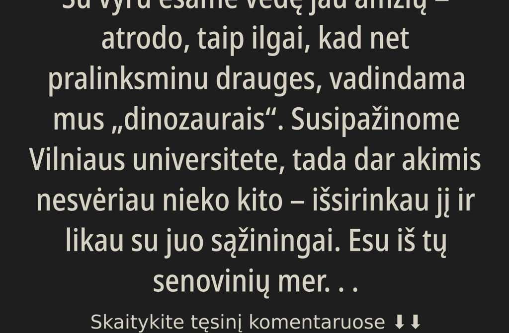 Su vyru esame vedę jau amžių atrodo, taip ilgai, kad net pralinksminu drauges, vadindama mus dinozaurais. Susipažinome Vilniaus universitete, tada dar akimis nesvėriau nieko kito išsirinkau jį ir likau su juo sąžiningai. Esu iš tų senovinių merginų, kurioms vienas vyras kaip vienas gyvenimas: nei žvilgčiojimų, nei slaptų simpatijų.