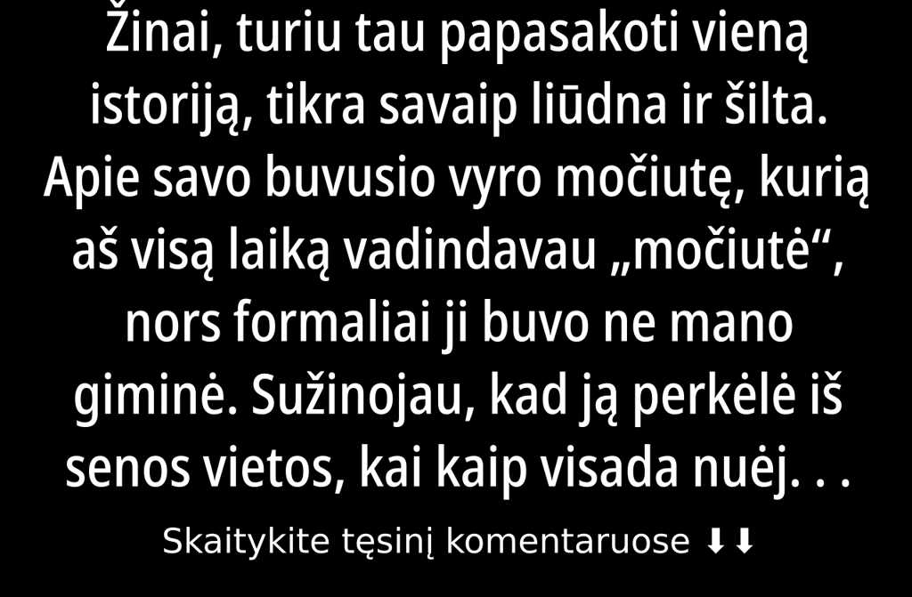 Sakau, buvusi mano močiutė iš tikrųjų tai buvusio vyro, Donato, močiutė. Susipažinom mes universitete, jis tada dar su močiute gyveno. Kai mane vedė susipažinti, kažkaip bijojau jaučiau, kad į patikrą eisiu. Nors Donatas neturėjo tėvų, tik močiutė, kuri jį augino nuo penkerių. Visgi per daug galvojau močiutė mane iškart priėmė kaip savo.