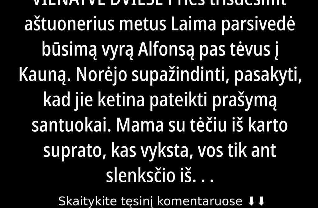 Prieš trisdešimt aštuonerius metus Laima parsivedė būsimą vyrą Alfonsą pas tėvus į Kauną. Norėjo supažindinti, pasakyti, kad jie ketina pateikti prašymą santuokai.