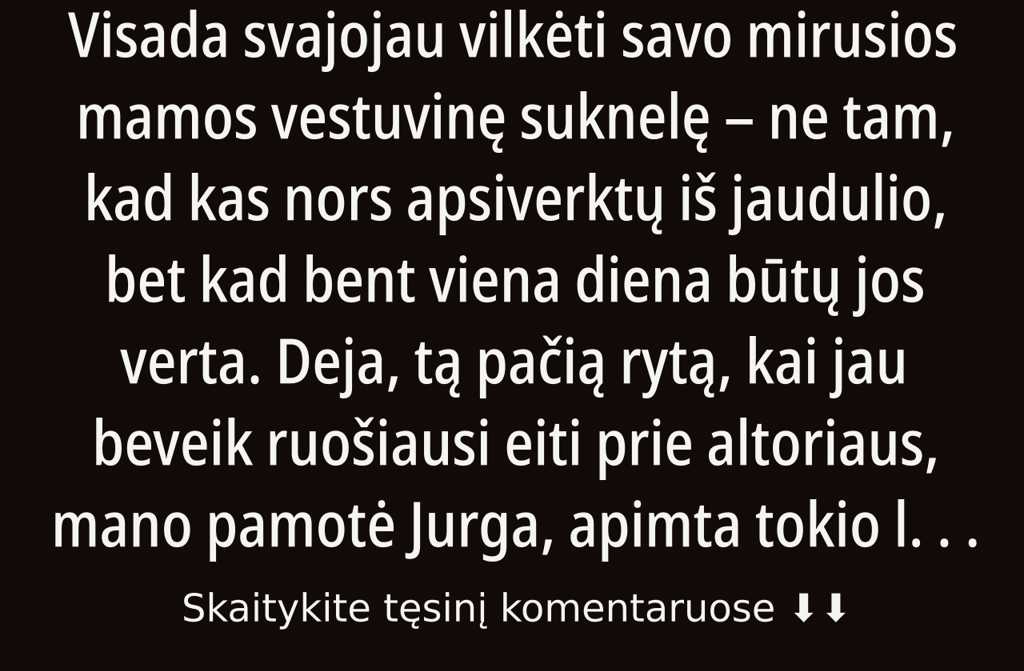Savo galvoje jau buvau nupiešusi, kaip žengsiu prie altoriaus mamos Mildos suknelėje juk tai daugiau nei tiesiog gabalas audinio. Tai paskutinis tikras ryšys, likęs su žmogumi, kurio netekau šešiolikos. Nuo tų laikų balta suknelė, persmelkta levandų kvapo, ilsėjosi tėčio balkone, kur jis ją uoliai slapstė. Kai susižadėjau su Tomu, akimirksniu žinojau tik ta suknelė. Tėtis pritarė, šyptelėjo net kiek per daug, bet Jurga pademonstravo tą savo tipišką, lietuvišką malonią, bet tik išoriškai šypseną, lyg bulviniai blynai be grietinės: valgyti galima, bet širdies nedžiugina.