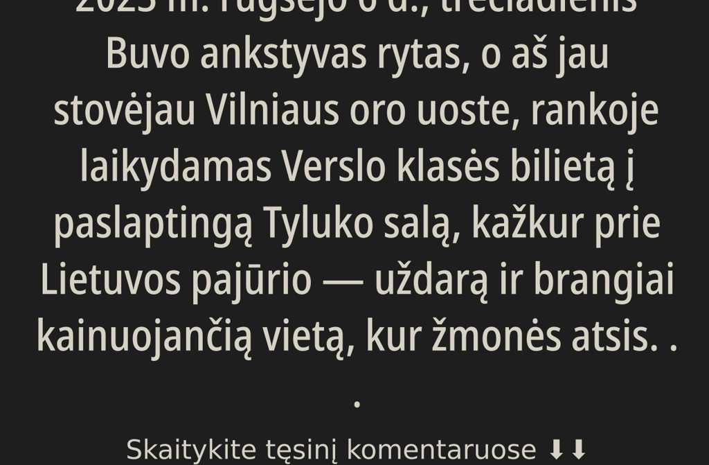 Buvo ankstyvas rytas, o aš jau stovėjau Vilniaus oro uoste, rankoje laikydamas Verslo klasės bilietą į paslaptingą Tyluko salą, kažkur prie Lietuvos pajūrio uždarą ir brangiai kainuojančią vietą, kur žmonės atsisako telefonų, o privatumas yra šventas. Tai buvo ta vieta, į kurią keliauja naujieji lietuvių milijonieriai, norėdami pasislėpti nuo pasaulio ir socialinių tinklų.