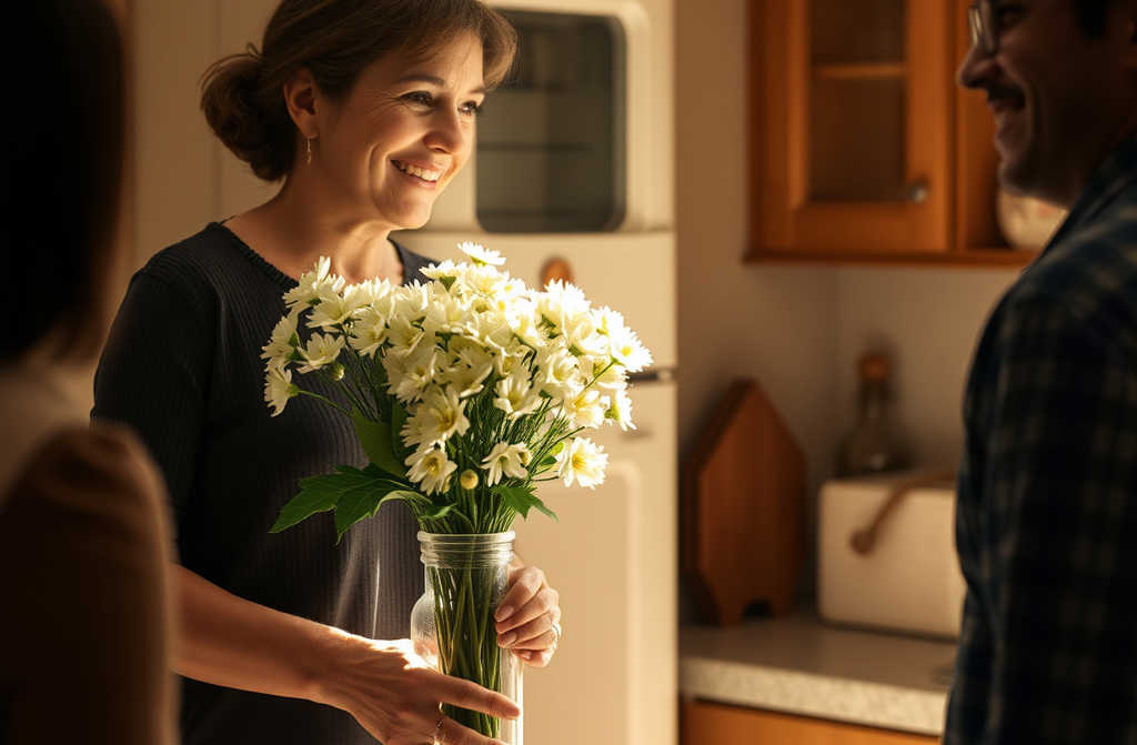 Aš sutinku, po dvidešimties minučių jis atvyko su mano mėgstamomis baltaisiais chrizantemais.