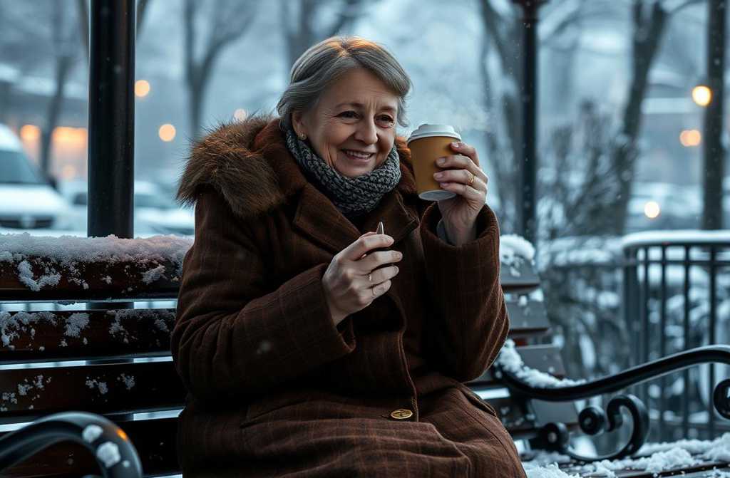 Австė обхватила горячий стакан замёрзшими ладонями, тепло разлилось по пальцам. Она села на скамейку под фонарём. Сэндвич был горячим, сыр тянулся, курица сочна. Это был самый вкусный ужин за годы, потому что она ела его одна, в тишине, никому не угождая. Смотрела на падающий снег, пила кофе и чувствовала себя живой.