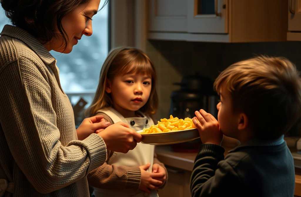 „Valgyk, nagi,“ Austėja paskubino sūnų, kuris lazdele braižė košę lėkštėje.